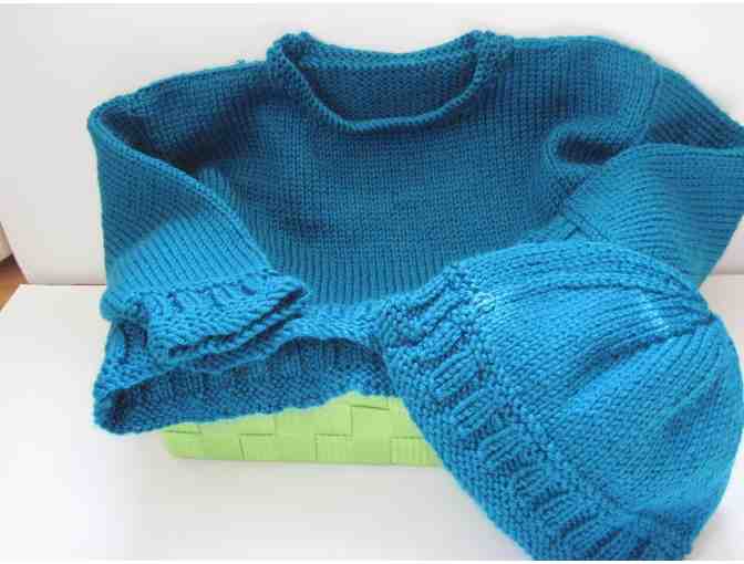 Child's Sweater & Hat Set . . beautifully hand-knitted Pullover sweater for your daughter or granddaughter in size 6. If hot chocolate dribbles down the front, no worries, Mom, all washable 'wool'. Donated by Cindy Horton