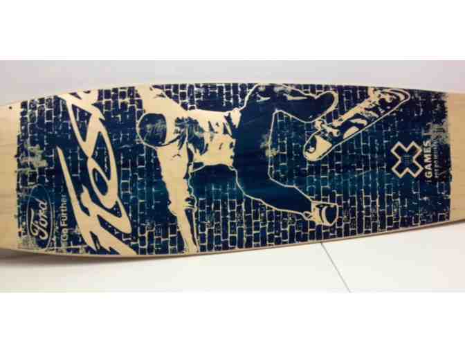 This artistic longboard measuring 43 inches long and 8.5 inches wide (in the center of the board) was designed and screen-printed onsite for the X Games in Brazil.