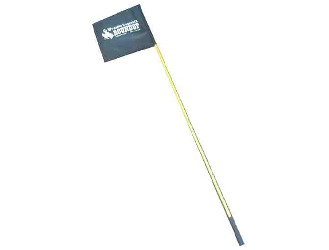 Yellow cattle sorting stick with Wyoming Livestock Roundup Flag.