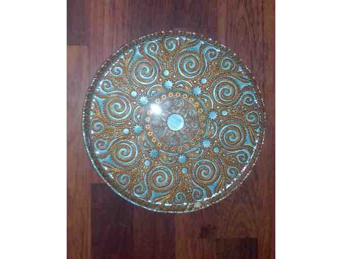 Hand painted glass and metal 12-inch round cake stand, blue-green with a gold color metal background, top edge of circle is slightly raised up. Elevated approximately 2 1/2 inches from a clear glass center piece. Back is metal with swirl design. Handmade in Istanbul,Turkey by artisans "using the age old tradition of Turkish glass making"