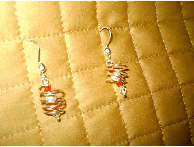 Lovely sterling silver spiral earrings, approximately 1" from post. Two orange crystals surround a round pearl instead the spiral.