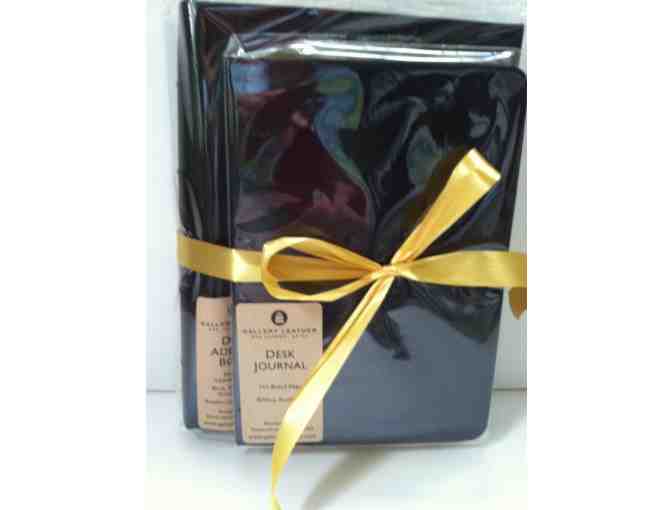 Gallery Leather Designs . . . two handsome leather desk accessories. So durable though your journal can easily travel from briefcase to backpack! Leave your desk address book at home. Both beautifully crafted in Maine. Donated By: Geoff & Anne LaFond; Gallery Leather Company