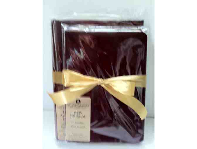 Acadia Red Desk Set . . . these handsome desk accessories are perfect for home or office. Desk address book has space for 480 addresses with records for work, home, cell phone, email and fax entries. The ring binding makes adding or removing pages a snap. Self adhesive labels are available for correcting one record at a time. The soft cover, book bound desk journal has 192 ruled pages. Donated by Geoff and Anne LaFond, Gallery Leather Company.