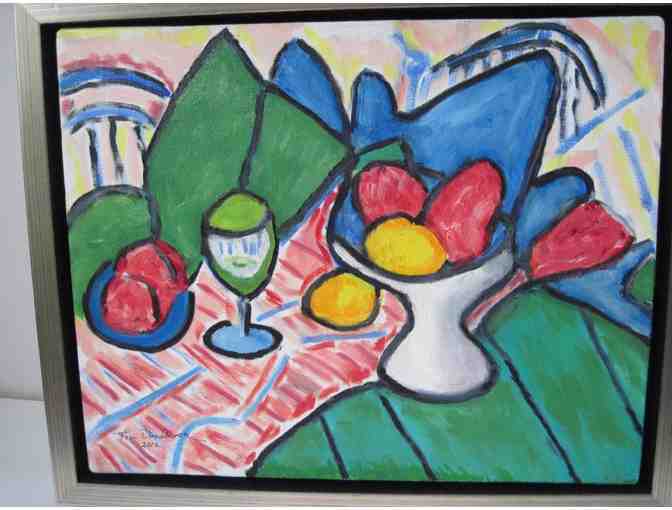 A Still Life . . . this is an acrylic painting inspired by local artist, Tom Donaldson and presented in a hardwood frame. Tom has had extensive experience with photography and more recently with watercolor and acrylics. His work has been shown at many Portland locations and most recently at the Falmouth Library. Donated by: Tom and Sheila Donaldson