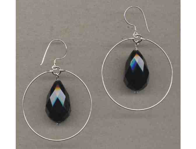 Handmade one-of-a-kind earrings with faceted black onyx teardrops on handformed sterling silver hoops and earwires - hang 2.5" long.