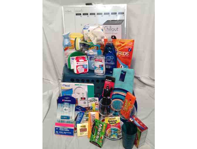 Send your student off to college the right way with this laundry basket stuffed full of all the necesssities! Includes supplies for laundry, cleaning and doing the dishes. Also includes school supplies like pens, surge protector, dry erase board, markers and more! Snacks and dishes also included!!