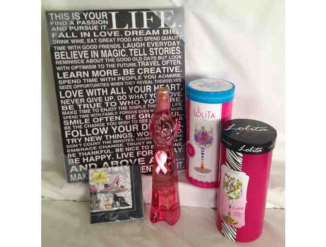 Add some sass into your life with the "This Is Your Life" wall hanging full of smart and timely advice. Toast to how well you are living YOUR life with this totally cool Pink Cat wine, two Lolita wine glasses ("It Girl" and "Wine Tasting") and a package of decorative napkins.