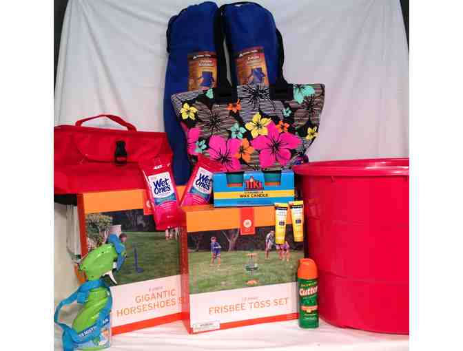 Enjoy summer with your family right in your own back yard. Set up your deluxe armchairs and watch the kids compete with the fun frisbee toss or gigantic horseshoes. The softside cooler and big red tub will hold all your snacks and drinks and the candles, bug spray and wipes will keep you cleand and bug free.