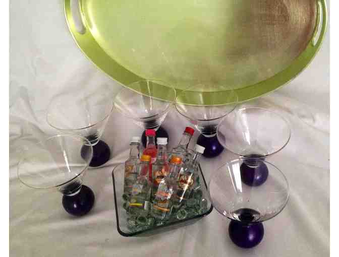 Any time is martini time with this set of six unique purple ballstem martini glasses. The gold serving tray really makes the color in the glasses pop. Just in case you want to start right away we've included a selection of seven mini liquor bottles to get you going.
