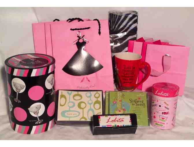 Lolita is always ready for fun and these handpainted Lolita margarita glass, Ornament and wine stopper are no exception! Keep the adorable and sassy mug, Sisters of Song CD, date cards and thank you cards for yourself or drop them into the "Fashionably Fun" gift bags and share with your funnest friends!