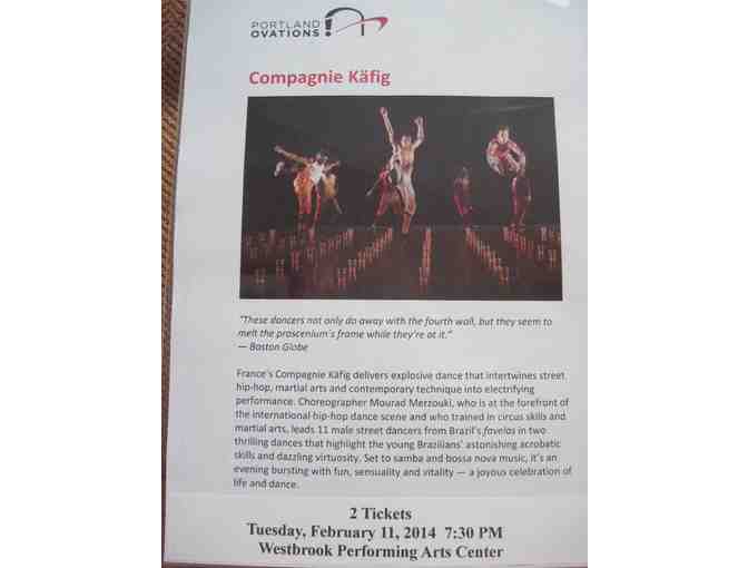 Compagnie Kafig . . . a joyous celebration of life and dance! France's Compagnie Kafig delivers explosive dance that intertwines street hip-hop, martial arts and contemporary technique into an electrifying performance. Your certificate entitles you to 2 best-available 'A-price' tickets Tuesday, February 11, 2014 at 7:30 PM at Westbrook Performing Arts Center. Enjoy this fun show! Donated By: Portland Ovations