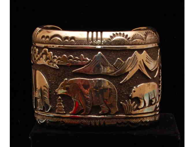 Sterling silver cuff bracelet, signed "Tommy Singer." Walking bear and mountain designs. Band is 2" wide. From the personal collection of Virginia Theo-Steelman.