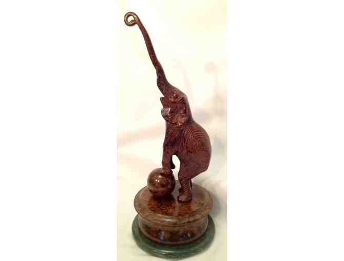 When an elephant raises its trunk it's a sign of good luck. This elephant mus tbe really lucky because he's got quite a stretch going on! This heavyweight metal statue is finished in a bronze color.
