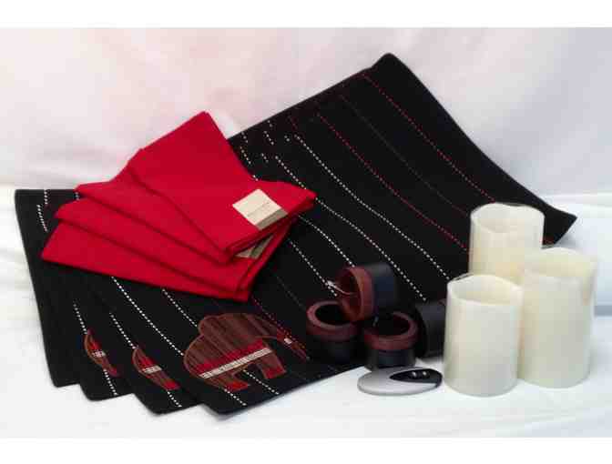 Black and red elephant motif placemats with matching red napkins and holders. Also includes set of 3 white battery operated candles.
