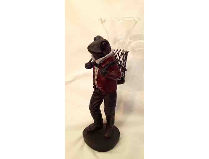 This froggy is going a'courtin' and he's bringing a beautiful glass vase in his backpack to hold his flowers!