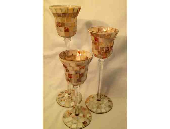 Just imagine the light reflecting off these three alternating height candle holders. The mosaic tile pattern with pearl and white tiles will reflect and match any decor while adding a touch of elegance.