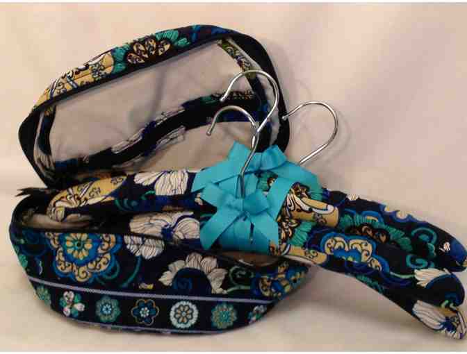 Vera Bradley Set including travel cosmetic bag in modern floral blue and 2 matching padded hangers.
