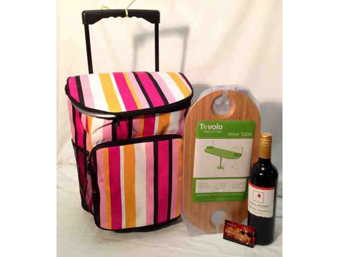 You'll enjoy Jazz on the Green with everything you need in this striped thermal wheeled bag. Swing by Cellar 19 in Council Bluffs with this $50 gift card to pick up delicious sandwiches, pasta salads or just a great selection of wines. We've include a bottle of Vista Pointe Cabernet Sauvignon to get you started as well as a Tovolo wood wine table. Just slie the stand into the ground to create a quick table to hold your stemwar in the cutouts and your snacks on top. Bring on the music!