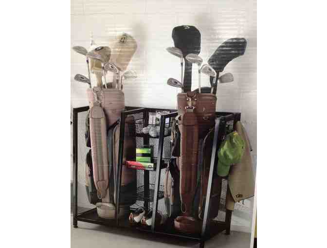 This metal storage rack will keep help keep the family golfers organized! Easily stores 2 golf bags, balls, and other golf supplies.