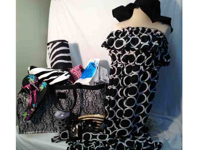 Not only will you be ins tyle with this adorable XL Mud Pie maxi dress cover up and foldable straw hat, you'll also be in style with this Black and white collapsible Trunkster three compartment bag for your car! The bag includes a thermal trunkster liner for your hot/cold items and a vapo pak to keep it cold, black/white drink tumbler, sunglasses, wallet/phone carrier, beach mat, beach towel, goggles, flip flops and wine. We even thought ahead and included a thermal wine bag with a great bottle of white wine!