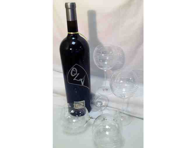 This set of four Mikasa ribbon and dots balloon wine glasses are delicate and amazing... but I think you might need more glasses if you're going to pop open this bottle of wine. The 3 liter bottle of Lodi Old Zin produced by Oak Ridge Winery is amazing and at this size it's only fair to share!