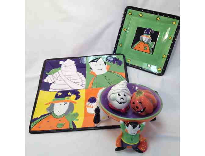 All of the goblins and ghouls will be excited to come to your Halloween party if you use these whimsical Halloween themed pieces. The large square plate is great for cookies or heavy appetizers while the smaller square will hold your crackers and the adorable elevatedd bowl is great for dip. Do't forget the seasoning with the mummy and pumpkin salt & pepper set.