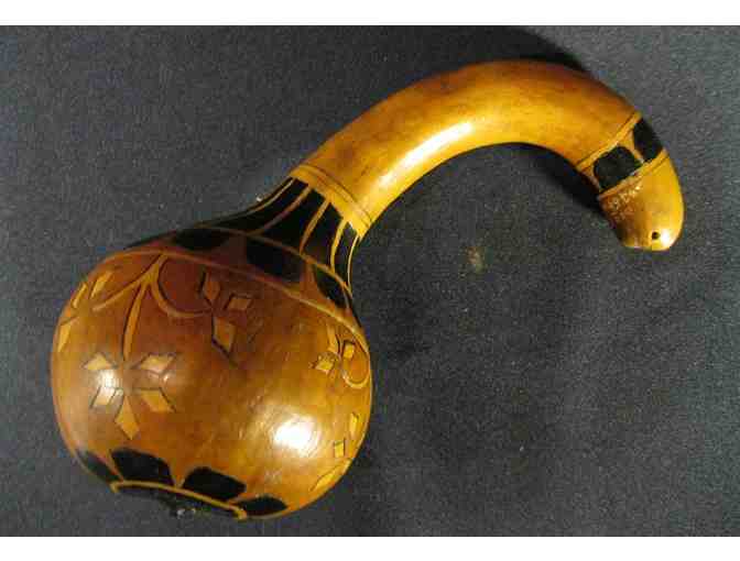 Gourd Rattle made by Jeanne Morningstar Kent, an enrolled member of the Nulhegan Band, Coosuk Abenaki of Vermont.  Rattle is beautifully decorated and signed, "Morningstar;" dated 2010.  Comes with certificate of authenticity from the artist.  Measures 9" long, 4" diameter.