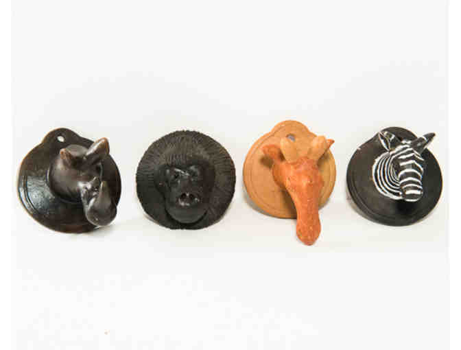 Set of four clay African animals including rhino, giraffe, zebra and gorilla that will bring a wild touch to any room. Handmade in Rwanda by local artisans. Each of the four pieces are 2"x 3"