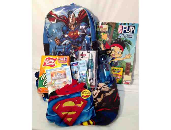 Enjoy this Superman back pack loaded with everything you need for spending the night at Grandma and Grandpa's house. Includes plush Superman throw,Superman pajamas with cape, popcorn, movie, nightlight, toothbrush & paste, and coloring book & crayons.