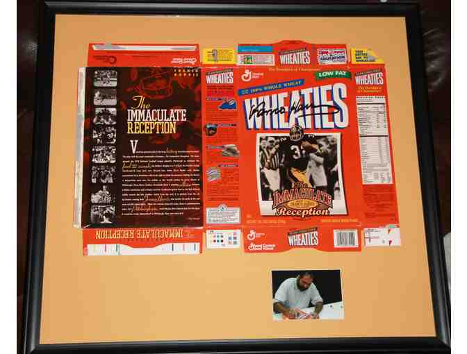 Framed and Autographed Immaculate Reception Wheaties Box. *Autographed by Franco Harris. Photo of signing included. Phil Musick writes, "Voted the greatest play in the long history of professional football. The play with the most memorable nickname The Immaculate Reception. The background: the 1972 National Football league playoffs. Pittsburg vs. Oakland. The final 22 seconds; the Raiders clinging to a 7-6 lead, the Steelers facing fourth-and-10 from their own 40-yard line. Under fierce Raider rush, Steeler quarterback Terry Bradshaw rolls to his right to elude the pressure. Falling, he throws a desperation pass over the middle as the breath catches in every throat at Pittsburgh's Three Rivers Stadium. Downfield, there is a jarring collision between a Raider safetyman and a Steeler receiver. A collective groan rises as the ball deflects wildly toward the left sideline. Inches form the turf, it is plucked from the air by Steeler running back Franco Harris, who sprints 42 yards to the end zone and NFL immortality. When the referee raises his arms, there is pandemonium and a 13-7 Pittsburgh win. Luck? Maybe. But a busted play for the ages. A reception surely. Immaculate? In Pittsburgh, they were sure of it." Wheaties Box - Year 1997 - Series 10