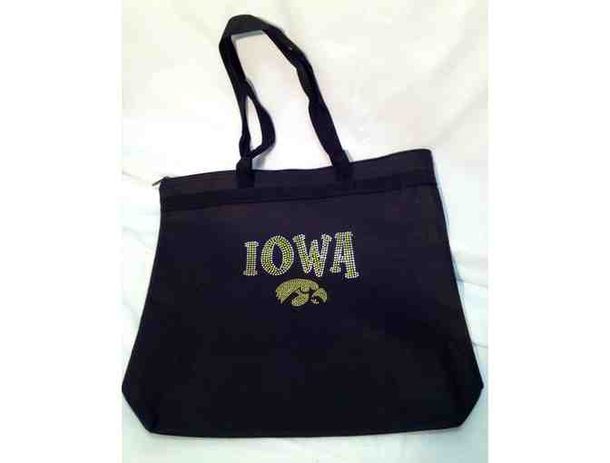 Show your Iowa spirit with this blinged out black tote sporting the Hawkeye logo!