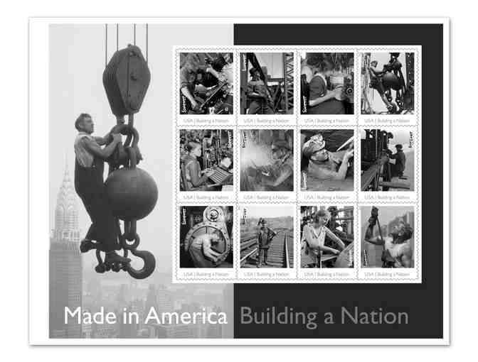 Five "Made in America: Building A Nation" stamp sheets are positioned one across by five down on this unique 8.25" x 33.75" press sheet with die-cuts. The five sheets showcase the same 12 stamp images of workers whose contributions were essential to the growth of the modern United States — an airplane maker, derrick man, millinery apprentice, linotyper, welder, coal miner, riveter, powerhouse mechanic, railroad track worker and textile worker, as well as a man on a hoisting ball and a man guiding a beam on the Empire State Building.