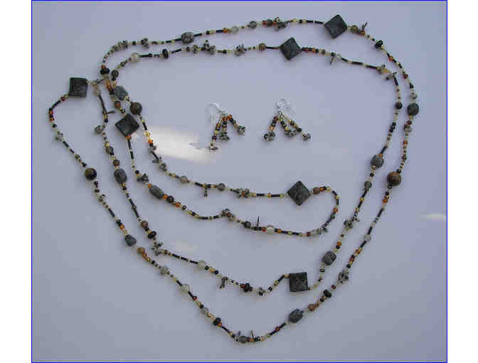 Handcrafted by the donor, this necklace is a full 84" long in one continuous loop, perfect for wrapping multiple times. The design is a free-form collection of beads including leopard skin, dalmation and Kambaba jasper, black dragon vein and gold lace agate, tiger eye, Sri Lankan natural red garnet, and hematite. Various sizes of glass beads including black jet bugle beads and spacers, Czech glass seed beads, antique white alabaster beads, and frosted crystal beads, as well as bronzed pewter charm links and spacers in a Celtic design.