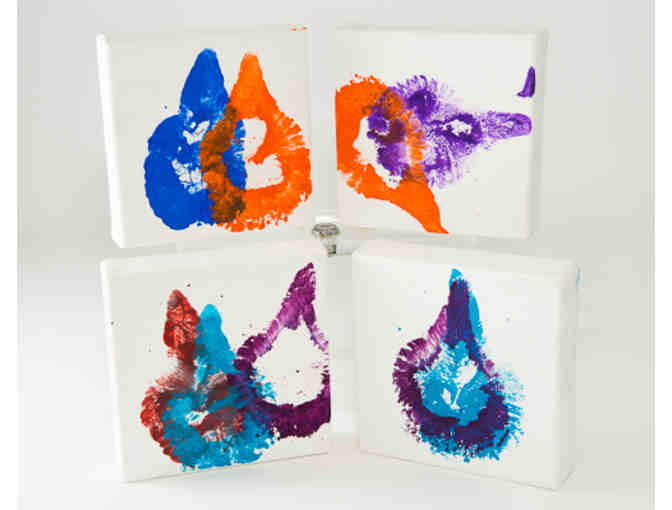 Set of 4 elephant kisses created especially for you by the Houston Zoo elephants. Each colorful elephant kiss is displayed on a 6"x6" canvas and can be displayed individually or as a complete set! Includes a short bio from the elephant "artist".