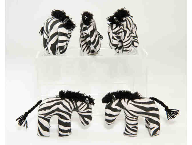 Stuffed animals are 3 to 3.5 inches high and 2 to 2.25 inches wide, as well as 5.5 to 6 inches long. Auction is for a "herd" of 5 fabric zebras.