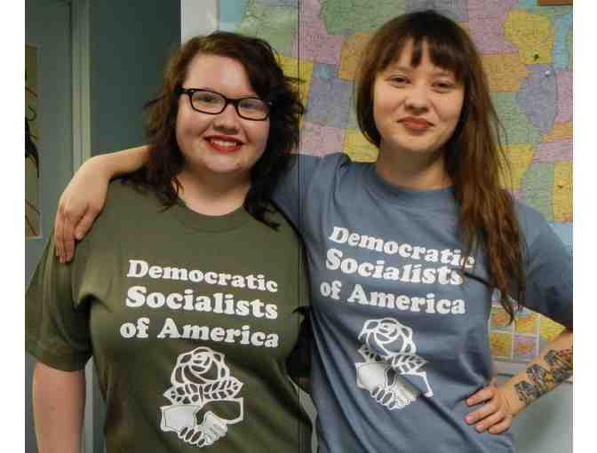 Blue or green (your pick) Democratic Socialists of America t-shirt with one of two slogans - "Abolish Student Debt" or "We Organize with Class".