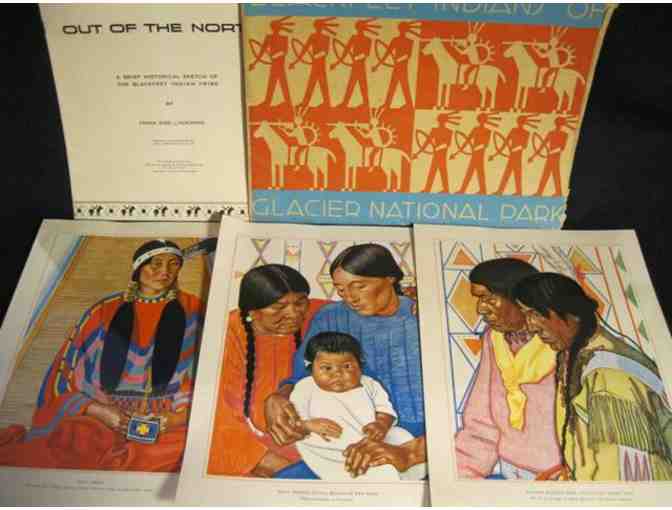 Each 9"x12" print is in a protective sleeve, and titled:  "Plume,""Not Real Bear Woman," "Long Time Pipe Woman," "Big Face Chief," "Juniper Buffalo Bull and Little Young Man," "Scalping Woman," "Buffalo Body"(this one has some blue ink smear), "Morning Gun," "Spopeia and Mameia,""Many Horses, Little Rosebush and Baby," "Only Child," and "Double Steel and Two Cutter."  Set includes the original cover and booklet, "Out of the North:  A Brief Historical Sketch of the Blackfeet Indian Tribe."