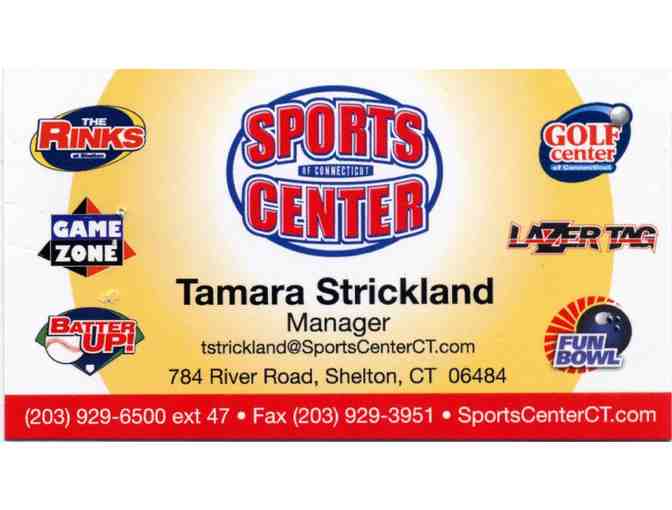 Enjoy mini golf for up to four people, one regular bucket of balls for the driving range, one fun bowl game token, four game zone tokens, one batting cage token, one lazer tag admission and one open skate admission to Sports Center of Connecticut in Shelton