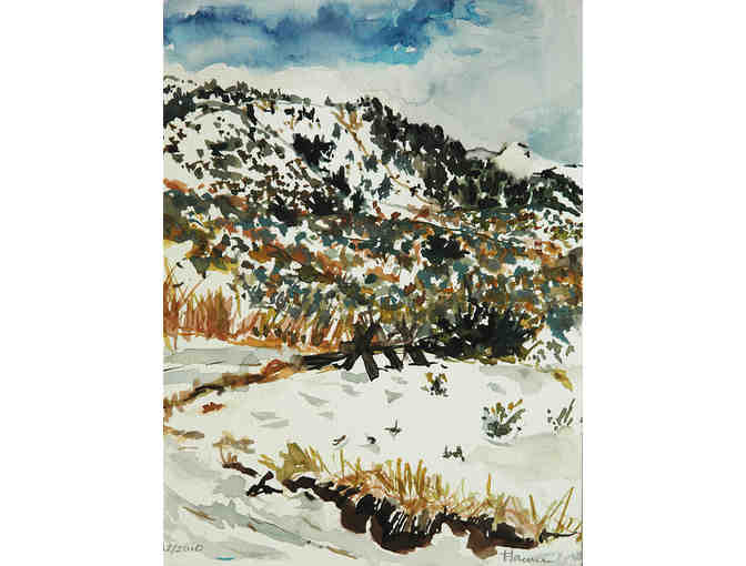 Florence Alfano McEwin’s 7” x 9” watercolor, Driveway Curve. Enjoy this window view of Northern Wyoming’s wintery landscape.