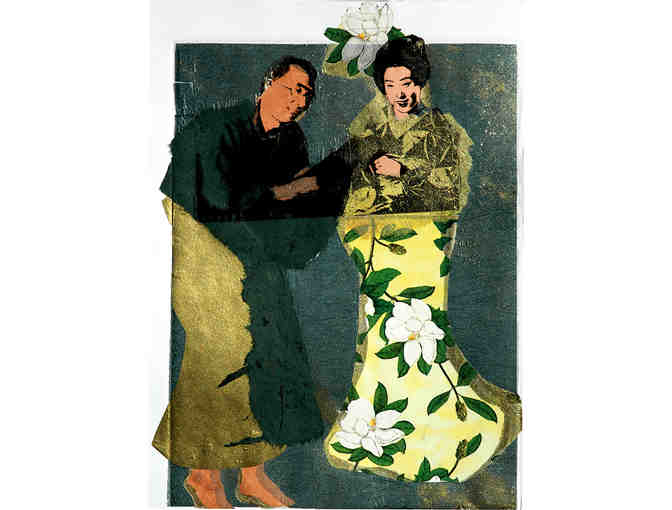 Together is from artist Florence Alfano McEwin's Tanabata Series: Together and Apart. The works produced in this series are one of a kind monoprints, hand-pulled and embellished with chine collé. They take impetus from the Japanese Folk Tale of Tanabata, where two stars come together once a year and wishes come true. The character images and print matrix are altered and manipulated from Japanese film. This particular image is from Sisters Of The Gion 1936 .