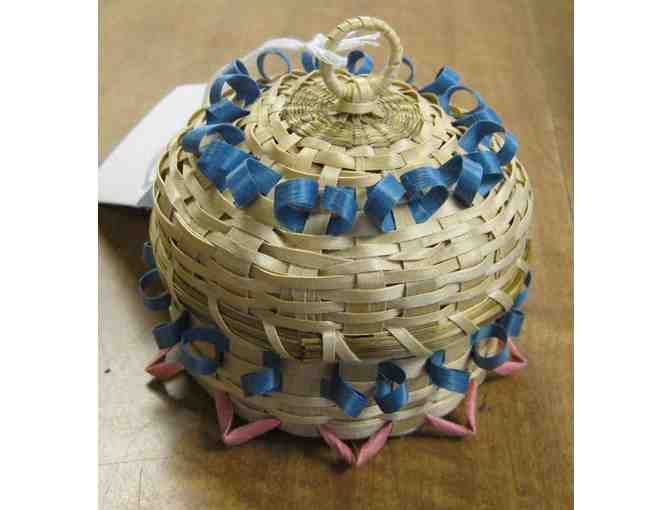 Beautiful ash splint basket, made by Liz Charlebois (2013), while demonstrating at Mt. Kearsarge Indian Museum.  Liz is MKIM's Director of Education, and is an accomplished Abenaki basketmaker.  Pink and blue dyed highlights. Sweetgrass woven into top of lid, and bundled around edge of lid.  2.5" high, 3" diameter.  Signed and dated.
