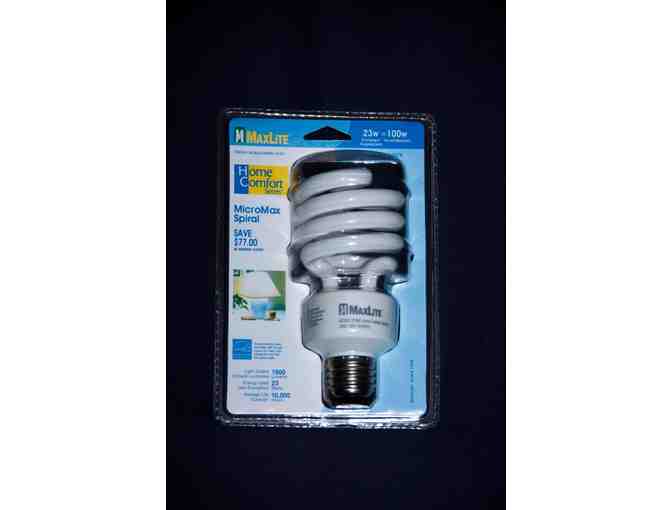 Save $77 a year with the MaxLite Home Comfort Spiral 23 watt bulb. This bulb is a great choice for general use around the home and is designed to replace a 90 watt incandescent bulb. It provides plenty of pleasant, warm white light for any task, while using just 23 watts of electricity. Set of 10 bulbs, new, never opened.
