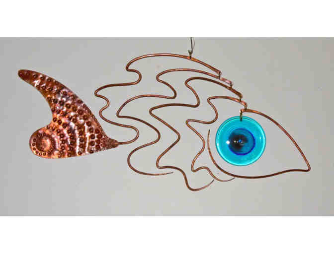 "Ophelia" is a unique GEO-KINETIC sculpture created by local artist Larry Lipsky. This tropical fish piece is made from copper and spun recycled glass for the eye. Dynamic movement that catches the eye and creates wonderful shadows. Everyone can appreciate this beautiful peice! This piece measures 21 inches in length anf 9 inches in height.