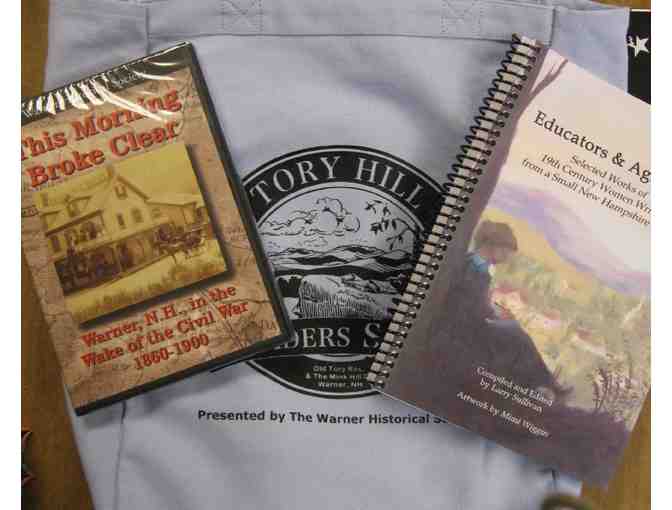 Warner, NH, Historical Society Gift Bag includes:  complimentary membership in the Warner Historical Society, the brand new book - "Educators & Agitators: Selected Works of 19th Century women Writers from a Small New Hampshire Town," DVD "This Morning Broke Clear" about Warner in the Civil War, all inside a Tory Hill Readers Series tote bag.