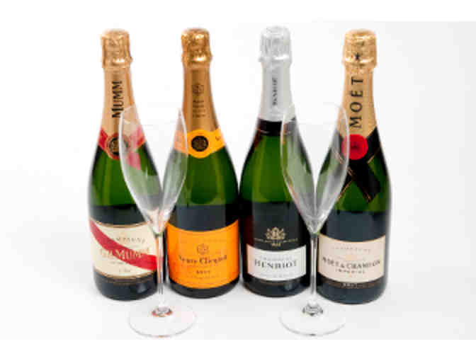 This package includes eight (8) premium 750ml French and California Cuvees including Henriot Blanc De Blanc, Laurent-Perrier Brut, GH Mumm Brut, Nicholas Feuillatte Brut Rose NV, Roederer Estate NV, Veuve Clicquot "Yellow Label" Brut NV, Moet & Chandon Brut NV, Pol Roger Reserve, plus 8 Riedel Champagne Flutes.