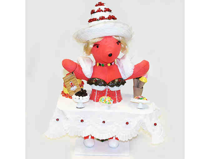 This Lorelei bear recreates the whimsical and hilarious "Vive La Glace Chaude" costume as designed by Alvin Colt. Her bustier is made of star-studded net with white lace boning, embellished with silver bells. The cupcake bra cups are dripping with chocolate frosting and topped with cherries. Her pannier holds all sorts of delectable sweets: a tiered yellow cake, milk-glass candy bowls filled with bonbons, multi-colored candies and sugar cookies, plus three cones of ice cream. To top it off, she wears a white straw hat with a three-tiered berry cake.