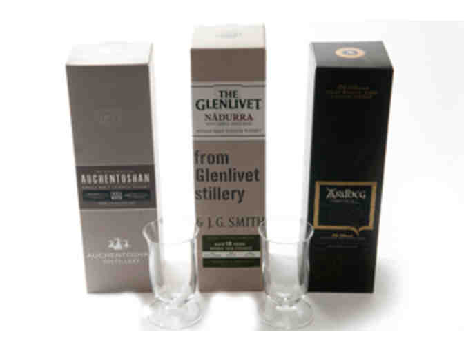 Eight Single Malts of rare distinction. Tomintoul 16, Glenlivet "Nadurra", Auchentoshan "3 Wood", Dalmore Gran Reserve and more. Accompanying these malts are 8 Riedel “Sommelier” Single Malt Scotch glasses.