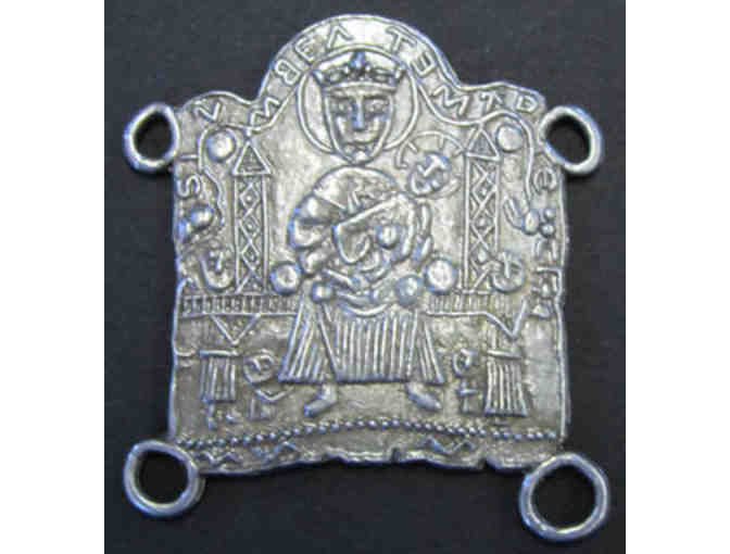 This unique treasure is an exact replica, in demension and design, of a 13th century pilgrimage badge. In medieval times, pilgrims sewed the medal onto their hat or clothing or wore it around their neck on a leather chain. This fine example of medieval craftmanship was intended for the numerous pilgrims who flocked to Chartres to seek Mary's intercession, many of them on their way to Compostella via Chartres.