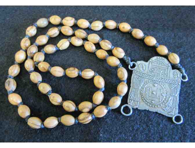 A Joan Curry original, this handcrafted necklace is made with olive wood beads from Bethlehem strung on waxed cotton, featuring a pilgrimage medallian. This unique treasure is an exact replica, in demension and design, of a 13th century pilgrimage badge. In medieval times, pilgrims sewed the medal onto their hat or clothing or wore it around their neck on a leather chain. This fine example of medieval craftmanship was intended for the numerous pilgrims who flocked to Chartres to seek Mary's intercession, many of them on their way to Compostella via Chartres.