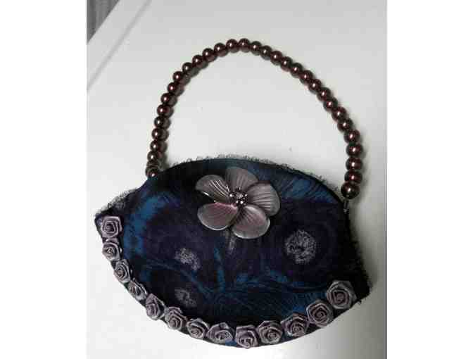 Handmade little purse made from a peacock fabric bra in teal, lavender and purple, with ribbon roses and metallic flower pendant. Handle is made of purple beads. The purse has enough room to carry a lipstick, keys and a small cell phone to a fancy event!